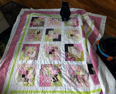 I finally my June quilt that was started in 2009. This is the last of my hand quilted projects. The fabric is Sultry by Basic Grey and it is MINE. I am putting it on the guest bed upstairs, if I can get the kittehs off of it.
